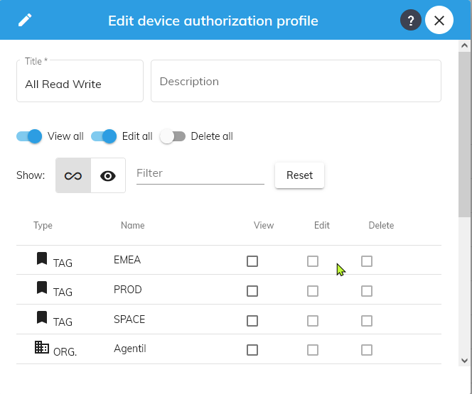 - Device authorization profiles allows to define visibility and permissions for a group of devices