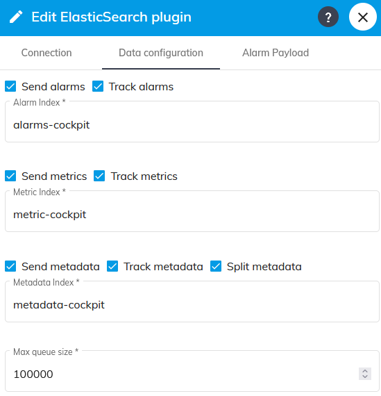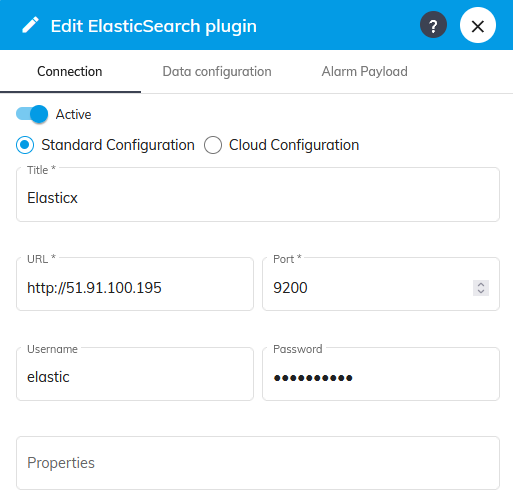 | Send alarms | If active, alarms received by the plugin will be sent to Elasticsearch | No |