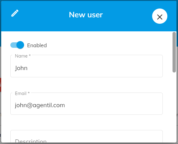 - Press Create or select Edit in the table action menu to open the user editor