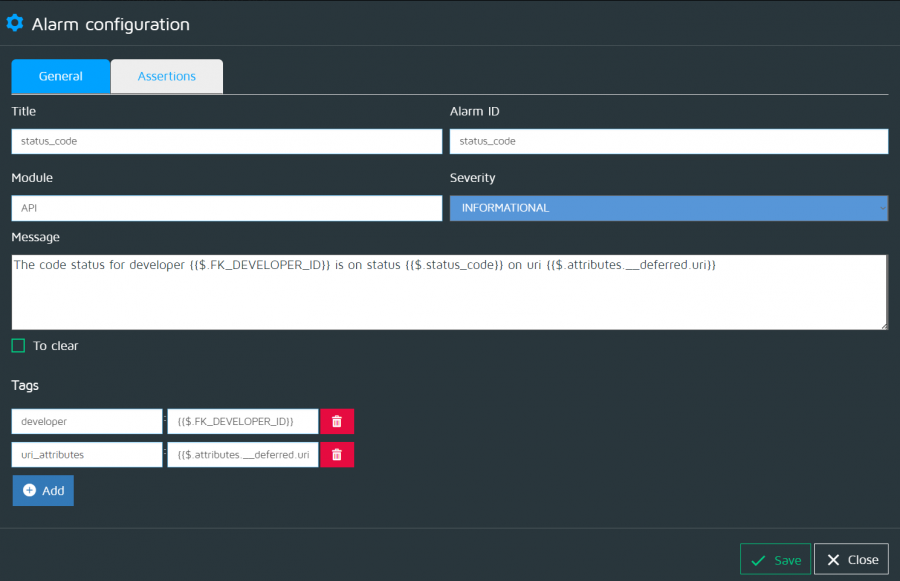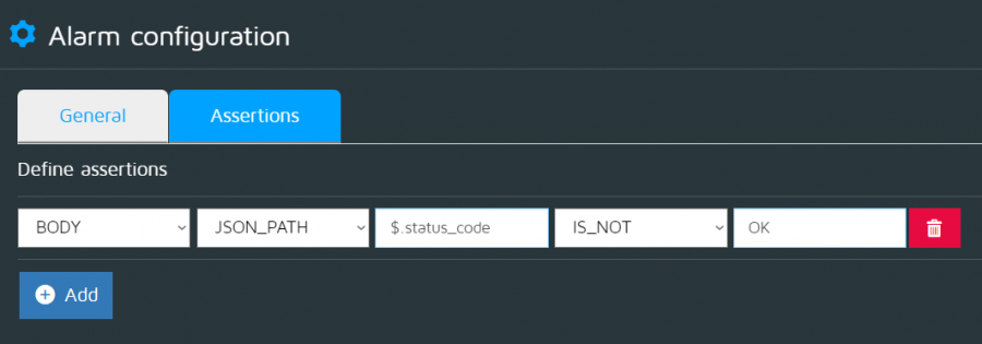 An alarm is defined by General parameter and assertions. The assertions will define the conditions to trigger alarms.