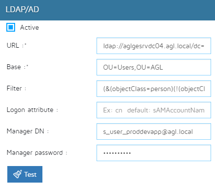 You can also enter a Username and Password, click on Test button to check if a particular user is well authenticated.