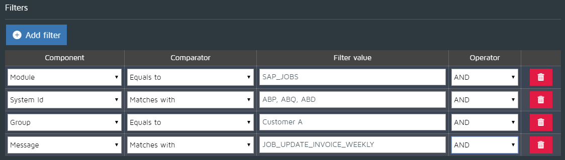 | Regexp | .*ABC.*DEF$ | Matches if value contains ABC and ends with DEF |