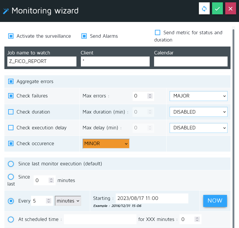 ABORTED stateABORTEDJob XYZ has been ABORTED on 2023/04/23 05:23aggregate mode is OFFABORTED15 jobs matching Z_ABC* name have been aborted (>=10) in the last 60 minutesaggregate mode is ONMax duration or Max start delay threshold to activate duration and delay monitoring (must be > 0)Abort. sev fieldaggregate option can be used to define the granularity of the monitoring:Job XYZ is running since 46 minutes (>=30 min)aggregate mode is OFF15 jobs matching Z_ABC* are delayed since 40 min (>=10)aggregate mode is OFFMax aborts threshold to activate job status monitoring (must be > 0)Duration/Delay severity fieldsaggregate option can be used to define the granularity of the monitoring:occurence severity fieldLoad jobs button to display the list of discovered jobsZ_ABC* → matches jobs starting with Z_ABC*_PROCESSING → will generate an error| Exclusion List | The exclusion list can be used when you activated to SAP jobs collection in the daily report monitor job. You can specify a list of jobs that you want to ignore, so they do not appear in the report. Note: This has no effect on the real time surveillance! |