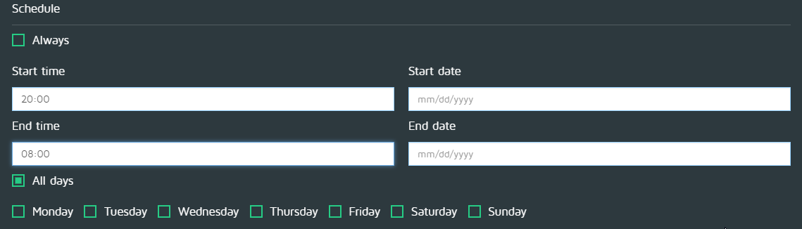 - Defines how to process the alert if it matches all above filters, including schedules and severities: