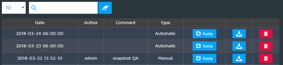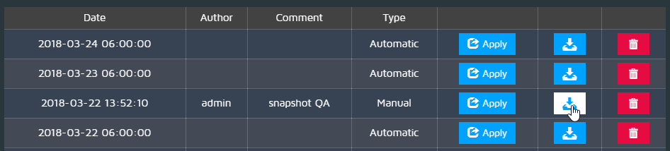 - It will be displayed in the table of available snapshots. From this table you will see snapshot date, comment and if it was added manually or generated automatically.