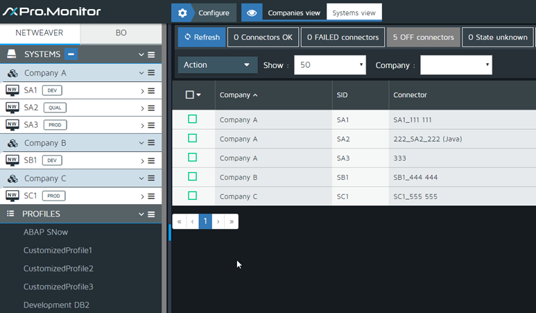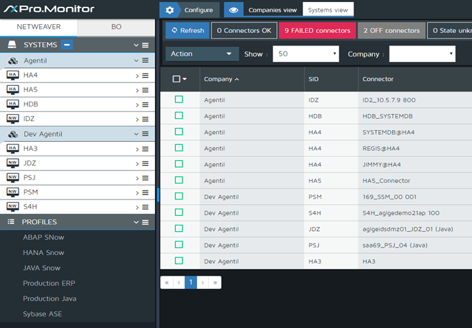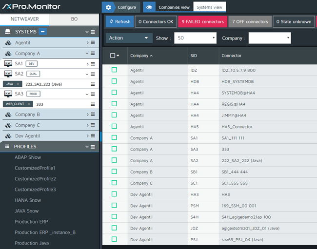 - It has in its database some companies, systems, connectors and monitoring profiles as in the image below.