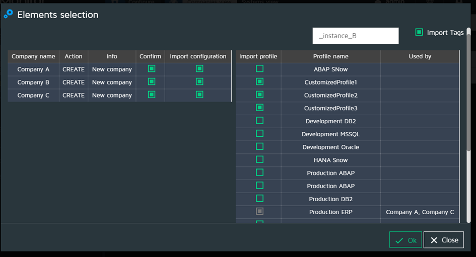 - Companies and Profiles present in the snapshot file to be imported (Redpeaks instance B) are displayed in two different tables