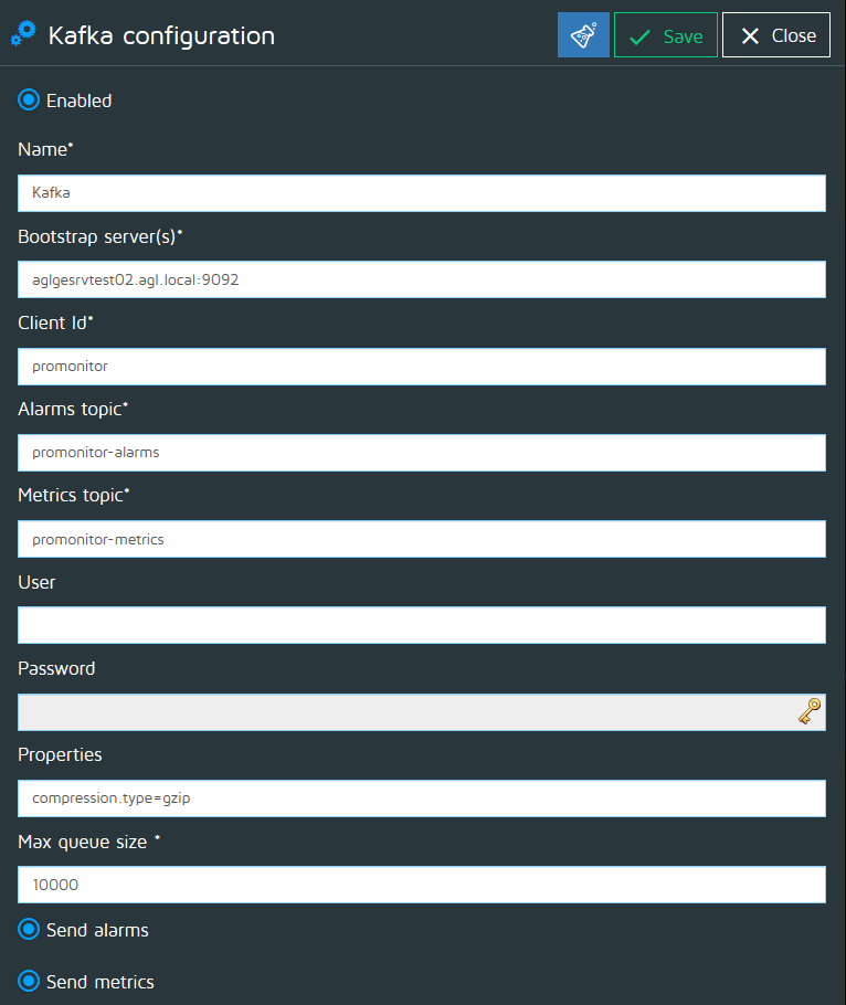 | Max queue size | The size of the queue holding the alarms and metrics | Yes |