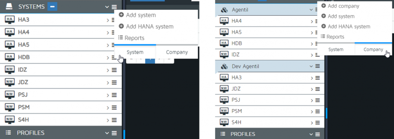 • Switch between these two tabs to display all Hana and Netweaver SAP systems or SAP Business Objects (BO) systems