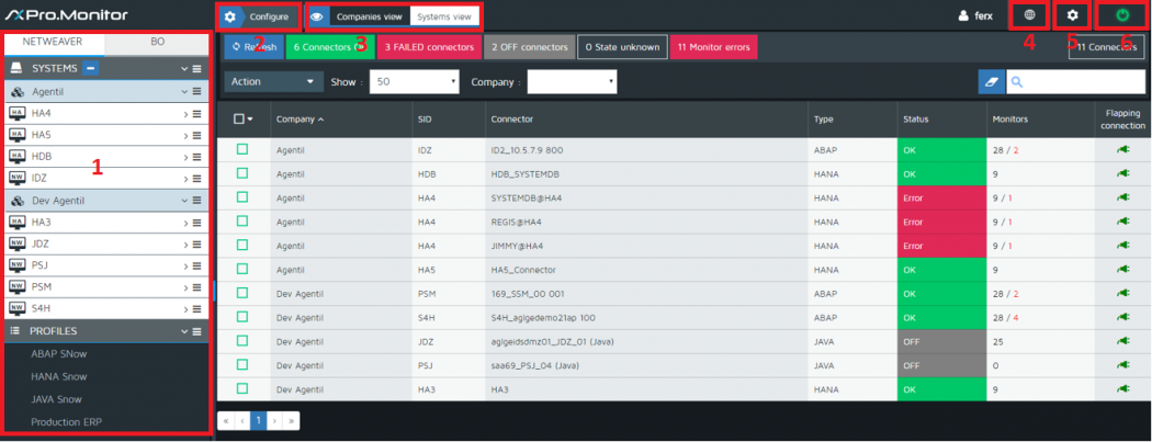 • Use these tabs to get a complete overview of all Companies or Systems and their specific information such as number of monitors being affected to Systems, those that had encountered errors during execution, flapping connectors, etc.